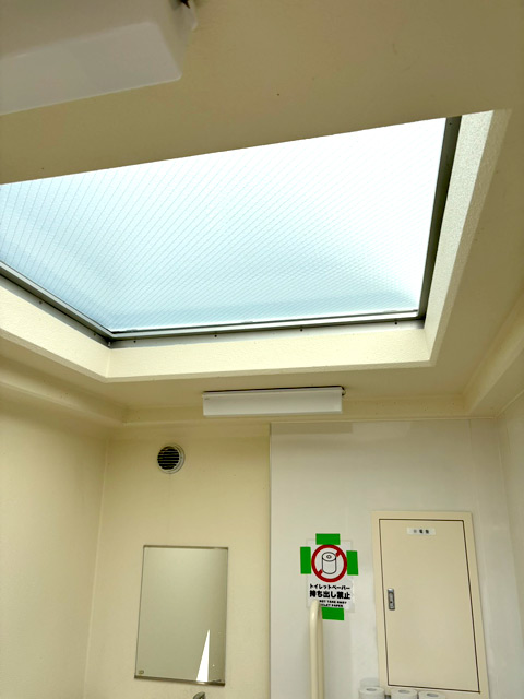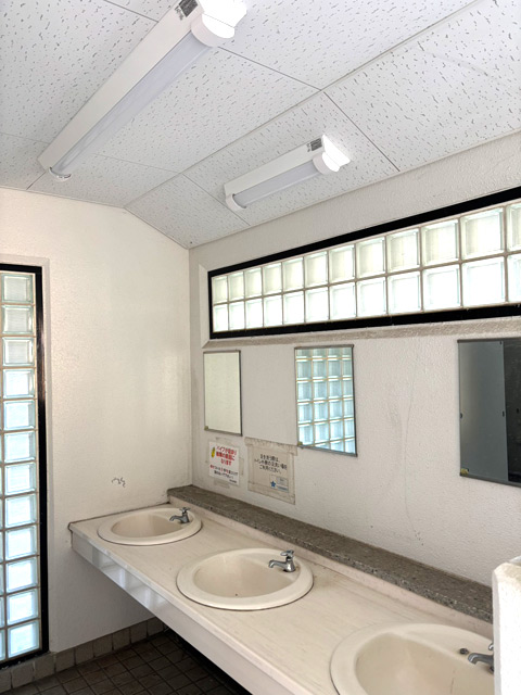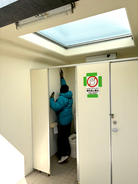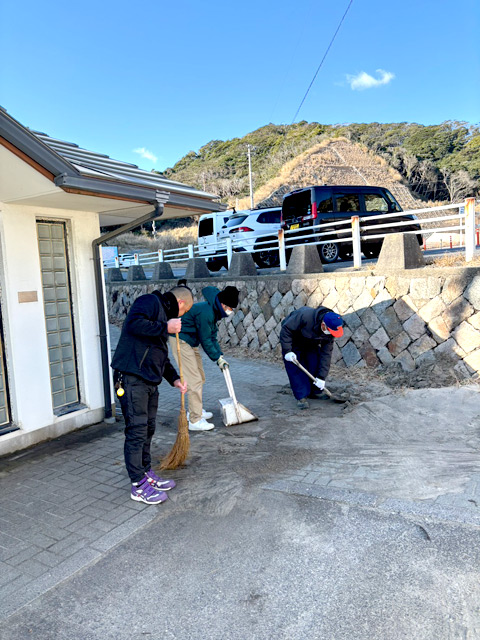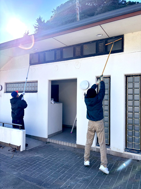 海風が強いなか、トイレ内外の清掃、砂かたしを行いました。